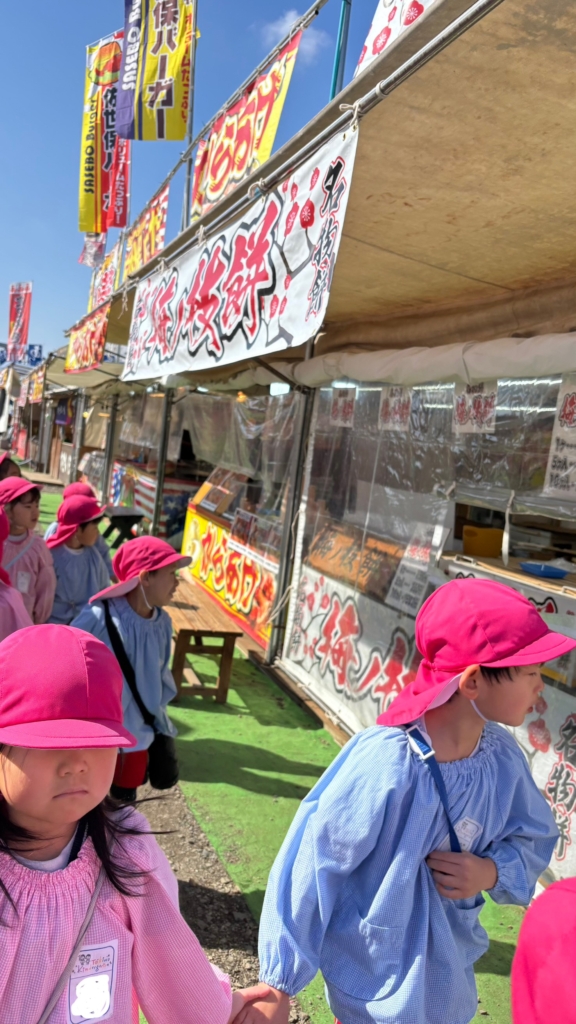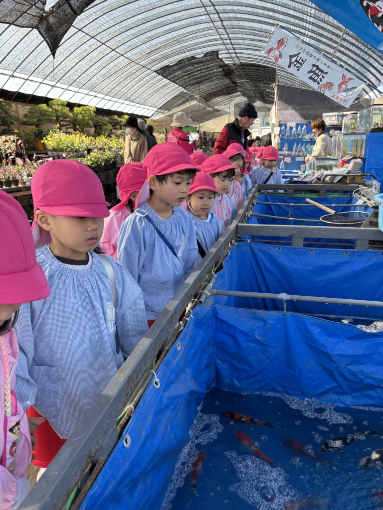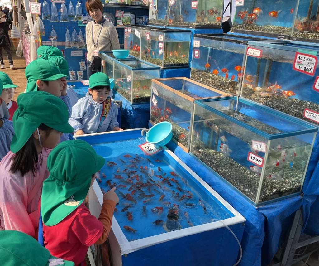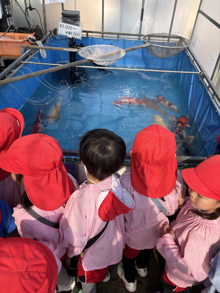 中にお魚を販売しているお店もあり、大きい鯉、いろんな柄の金魚に興味を持って観察する子どもたち。