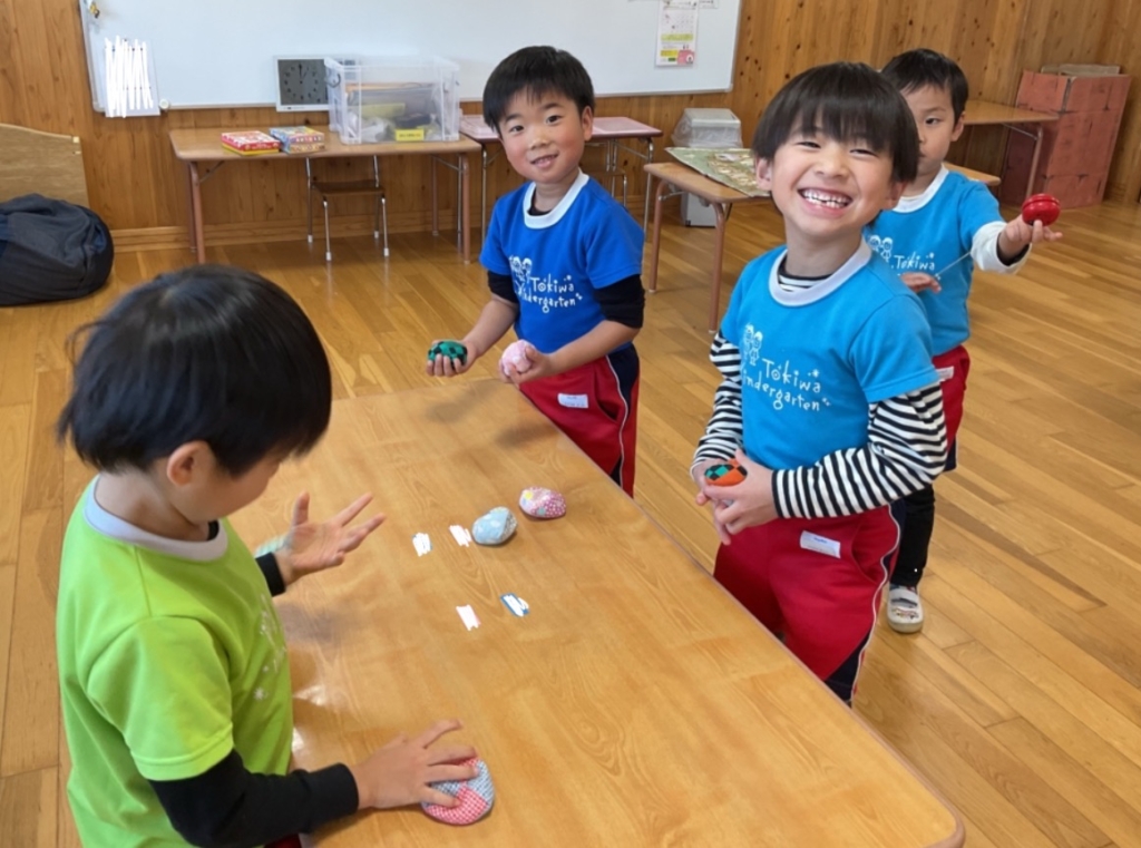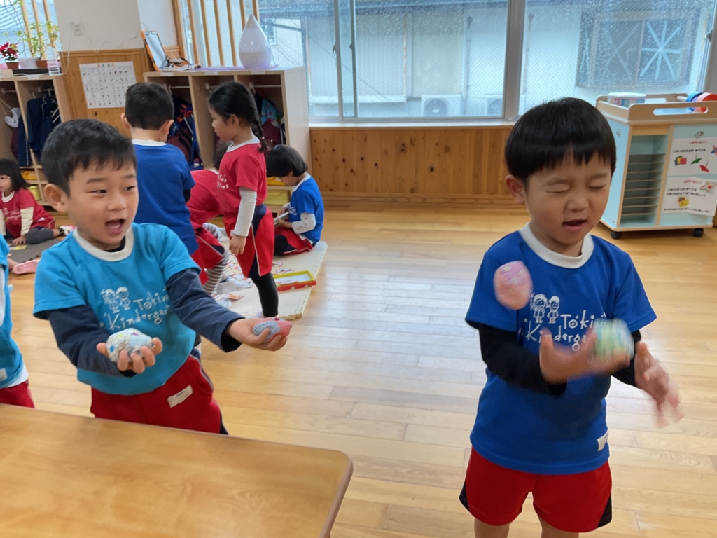 お手玉では、投げたり取ったりしながらリズムよく遊ぶことを楽しみましたよ🤹