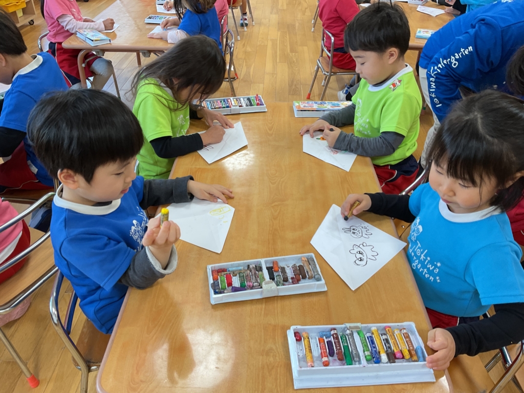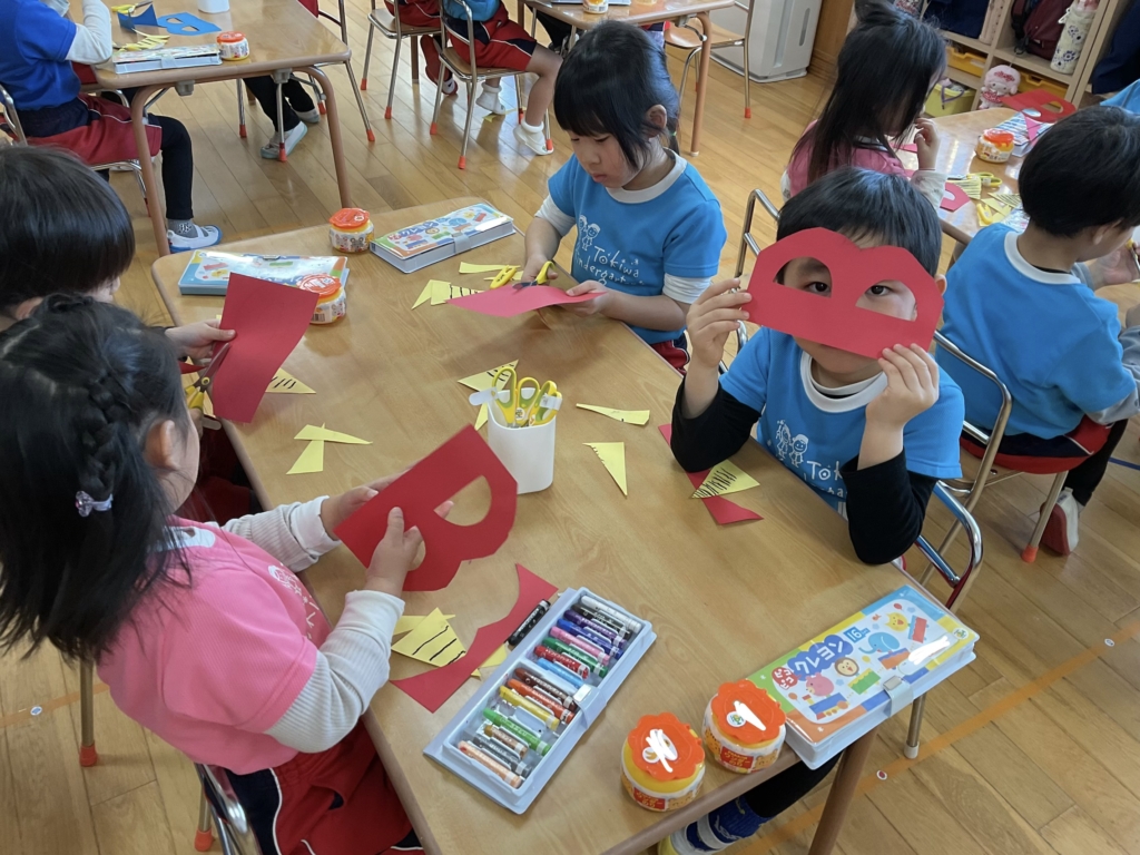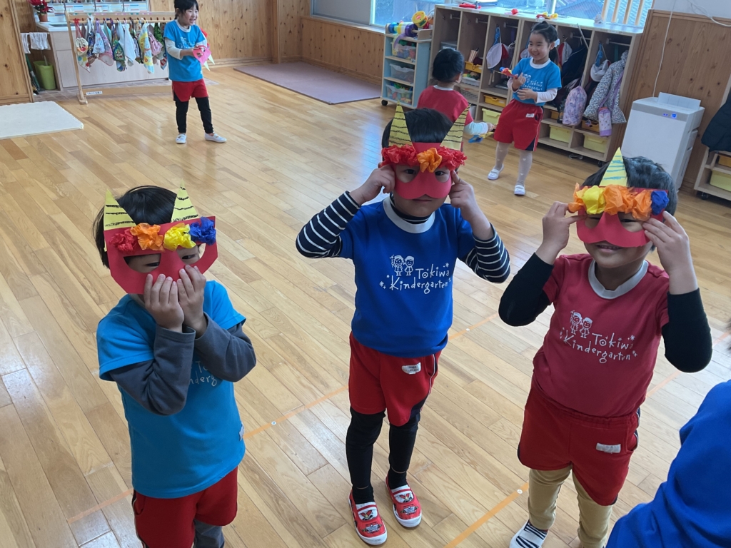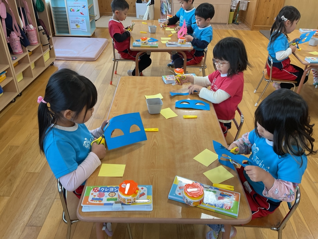 はさみで鬼のツノと面を切りました。まっすぐな線、曲がった線も集中して切ることができていました✂️はさみの使い方も上手になりましたね⭐︎