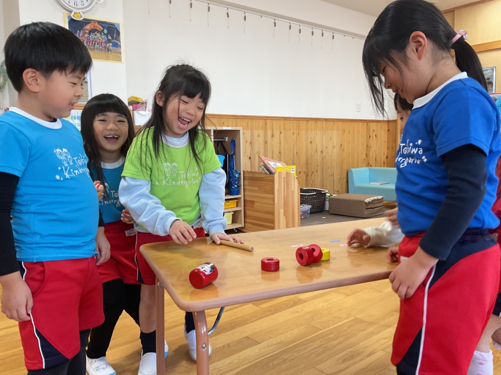 だるま落としでは、力加減を考えながら順番に打ち、友達と声を掛け合いながら挑戦する姿が見られましたよ👹